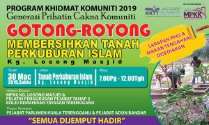 Satu Program Khidmat Komuniti “Generasi Prihatin Cakna Komuniti” anjuran bersama Pelatih Penyeliaan Pejabat Tahap 3,Kolej Kemahiran Yayasan Terengganu (KKYT) dan Majlis Pengurusan Komuniti Kampung (MPKK) Losong Masjid akan mengadakan ‘Gotong-Royong Membersihkan Tanah Perkuburan Islam Kg.Losong Masjid’ pada ketetapan berikut :-